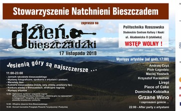 17 listopada 2018 roku zapraszamy na II edycję Dnia Bieszczadzkiego „Jesienią góry są najszczersze”, która odbędzie się w Studenckim Centrum Kultury i Nauki PRz przy ul. Akademickiej 8.