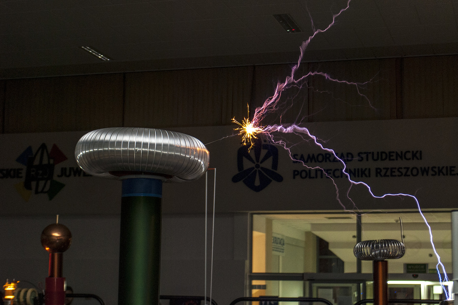 Popularną atrakcją Nocnych Spotkań z Nauką był także „teatr wysokich napięć”, wydarzenie zorganizowane przez firmę Polimedia, partnera Dni Otwartych Politechniki Rzeszowskiej, która współpracuje z uczelnią w ramach Politechniki Dziecięcej. Firma Polimedia przygotowała m.in. spektakl z wykorzystaniem jednych z największych w swoich klasach transformatorów Tesli. Współorganizatorem wydarzenia było Studenckie Koło Naukowe Elektryków „MegaVolt”. Zaprezentowane zostały urządzenia wykonane przez członków koła – generator Van der Graafa, lampowa cewka tesli (VTTC) oraz zademonstrowano wyładowania pod obniżonym ciśnieniem. Wszystkie zawiłości obserwowanych zjawisk i urządzeń wyjaśniał opiekun koła – mgr inż. Sebastian Hajder.