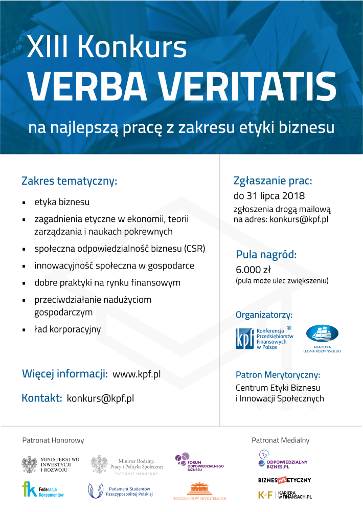Konferencja Przedsiębiorstw Finansowych oraz Akademia Leona Koźmińskiego ogłosiły XIII edycję konkursu VERBA VERITATIS. Dla zwycięzców przewidziana została łączna pula nagród w wysokości min. 10 000 zł.