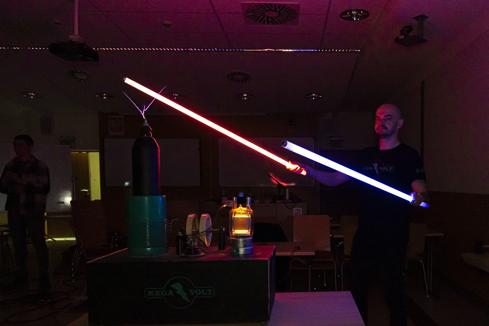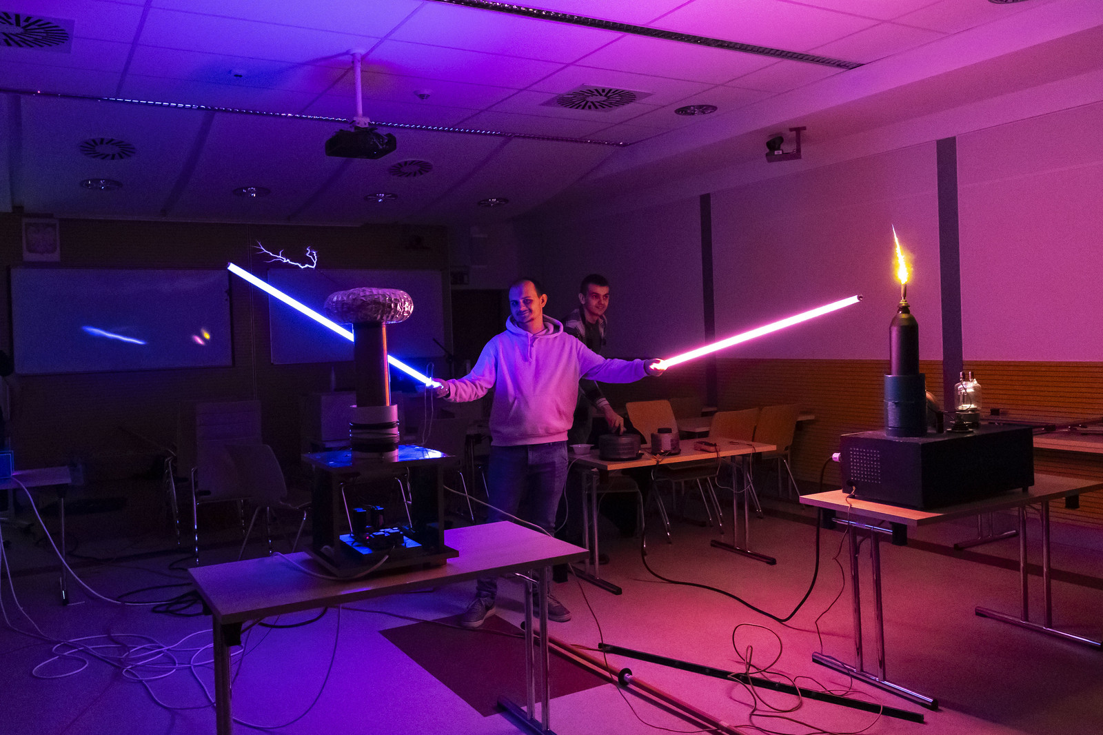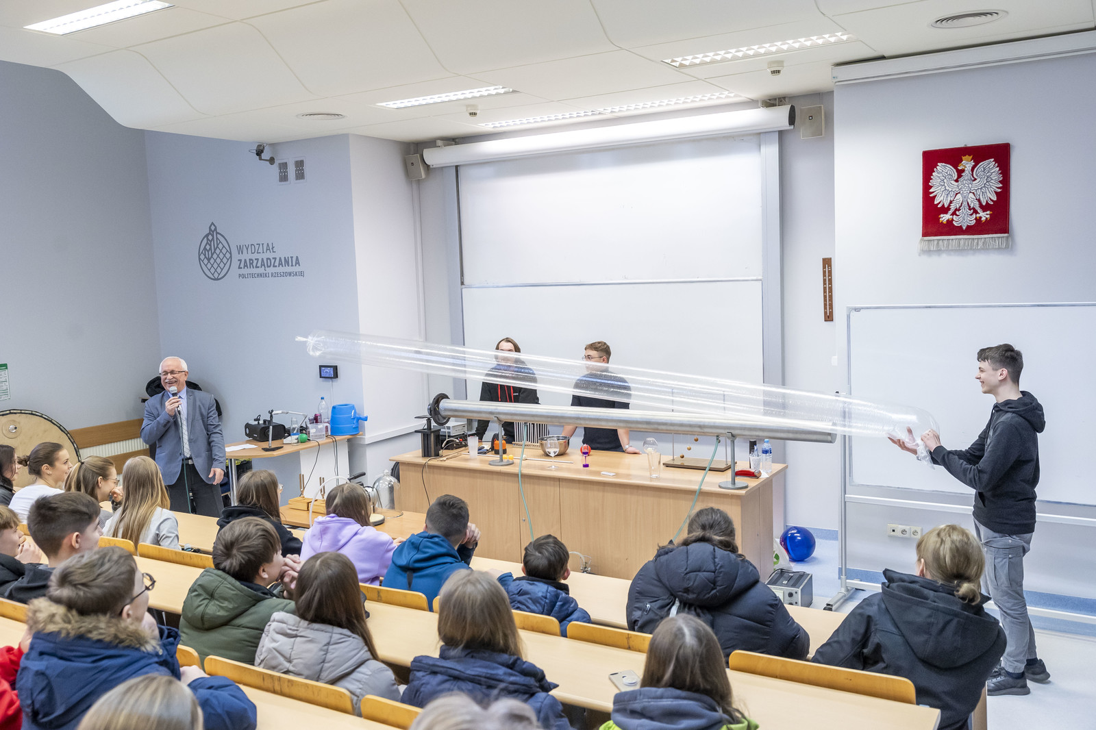 Wydarzenie uświetniły ciekawe pokazy przygotowane przez koła naukowe działające na naszej uczelni. KN „ESPRIT” z Wydziału Chemicznego zapewniło wiele „wybuchowych” niespodzianek, KN „FOTON” z Wydziału Matematyki i Fizyki Stosowanej zademonstrowało wybrane prawa i zjawiska fizyczne, natomiast Koło Naukowe MegaVolt z Wydziału Elektrotechniki i Informatyki zaprezentowało pokaz wysokich napięć.